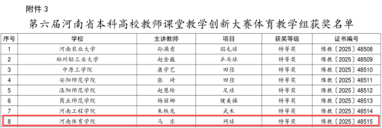 近日,河南省教育厅印发《关于公布第六届河南省本科高校教师课堂教学创新大赛外语教学组、实验教学组、体育教学组获奖名单的通知》(教高〔2025〕235 号),我校教师马乐凭借《网球》教学项目,在体育教学组竞赛中斩获特等奖。
